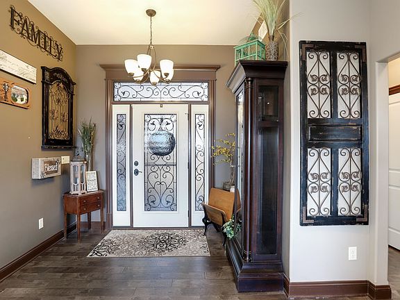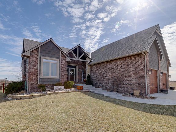 Welcome to your dream home nestled on 6.81 acres of picturesque landscape with breathtaking views facing east towards the Ninescah River and a serene tree row adorned with a tranquil pond and a charming windmill that aerates the pond. This stunning ranch-style residence offers an abundance of luxurious amenities and ample space for comfortable living and entertaining. As you step inside, you'll be greeted by almost 3200 square feet of meticulously finished living space, featuring five bedrooms and three bathrooms. The main floor boasts 10-foot ceilings, enhancing the sense of spaciousness and elegance throughout. The heart of the home is the expansive kitchen, complete with granite countertops, an oversized island, and top-of-the-line appliances including an induction stove top and a convenient pot filler. Built-in storage cabinets add both functionality and style to the island, while a walk-in pantry provides ample storage space. The main floor living room is adorned with a cozy wood-burning fireplace, perfect for chilly evenings, while wood laminate flooring adds warmth and character to the living space. Retreat to the sprawling master suite, measuring 26x14, which offers a luxurious sanctuary with a spacious primary bathroom featuring a large shower, double sinks, water closet, and a linen closet. The primary closet conveniently connects to the main floor laundry room for added convenience. Venture downstairs to the finished view-out basement, where you'll find nine-foot ceilings, a wood stove with a blower, and a wet bar, creating the ideal space for relaxation and entertaining. Two additional bedrooms and a bathroom provide plenty of room for guests or family members. Step outside to enjoy the expansive east-facing backyard, complete with a covered maintenance-free deck overlooking the stunning views towards the Ninescah River. The property is complemented by a 60x40 outbuilding, featuring a 16-foot door, a 12-foot door, and a loft, perfect for storing vehicles, equipment, or creating a workshop. The outbuilding is equipped with 50 amp and waste station for RV, along with an 8" thick rebar concrete floor with electricity. Other notable features of this exceptional property include an attached three-car oversized garage with insulated garage doors and hot/ cold water hookups, a sprinkler system around the house, an irrigation well, and a fenced yard. An electrical hookup outside is ready for a generator, ensuring peace of mind during power outages. Additionally, a tankless hot water heater provides efficient and endless hot water supply. To top it all off, the hot tub will remain with the home, offering the perfect spot to unwind and soak in the beauty of your surroundings. Don't miss the opportunity to make this extraordinary property your own and experience the ultimate blend of luxury, comfort, and natural beauty. Schedule your private tour today!
