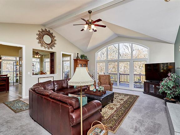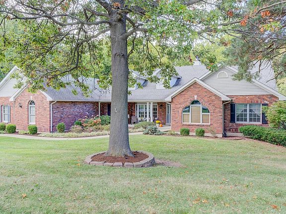Custom built executive ranch on private .78 ac wooded lot. Stone's throw from Wapelhorst Park's tennis, pickleball, pool, etc. Hwy 364 nearby. Enter foyer and view the great rm. wall of windows. Large office has attractive windows and crown molding same as entry and hall. Vaulted ceilings in great. rm., kitchen, and master add a spacious feel. Great rm. has gas fireplace and entry to lg deck. Coffered ceiling and bay add elegance to formal dining rm. Kitchen loaded with light has granite island, pull-out shelves, appliance garage., desk, and lg. pantry. A 1/2 bath by side-entry 4-car garage and laundry rm. Master suite has door to private deck. Lower 1300 sq ft has 2 bed, 1 1/2 bath, family rm. with gas fireplace., 9' ceilings and entry to lg. patio. This quality home has a unique blend of comfort and sophistication. Two almost 1/2 ac lots on either side of home for sale. Agent Owned.