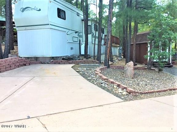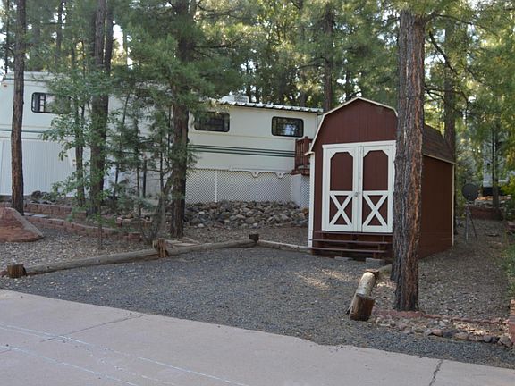 Nestled back in the tall pines this lot has great views! RV is skirted and has decking and a concrete patio. 2 parking spaces on this spacious lot. Need a place to store more stuff? The shed it already set up! HOA includes your water, Trash, Sewer, and common area.