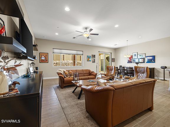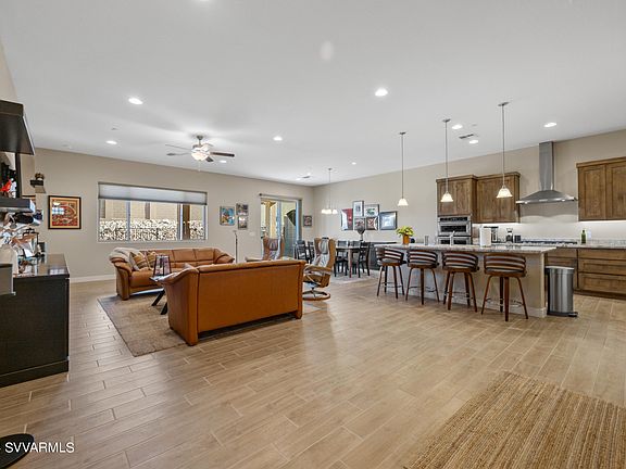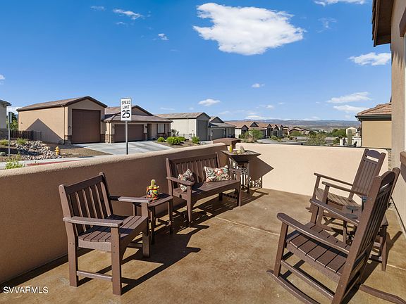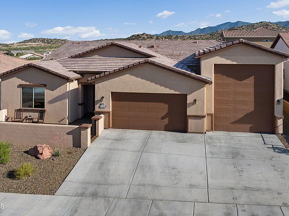 Beautiful Mesquite Hills at the base of Mingus Mountain! Walk into a very open living room w/gourmet kitchen, white springs granite/alder cabinets/ gas cook top/built-in oven micro combo/ huge walk-in pantry. Large dining room, master bedroom and guest bedrooms. Whole house plank tile. Backyard is a private paradise with oversized covered patio with extendable shades, built in BBQ kitchen featuring Traeger Grill, gas Blackstone griddle, refrigerator and TV. Gorgeous low maintenance landscaping. Front courtyard has great views. This home is an EnergyStar/Indoor Air Plus home with 20 owned solar panels which makes this a very efficient home with low utilities. Attached 2 car garage with a bonus 44' 3rd car or RV garage, with 14' tall door & full RV hookups. See attached upgrade list.