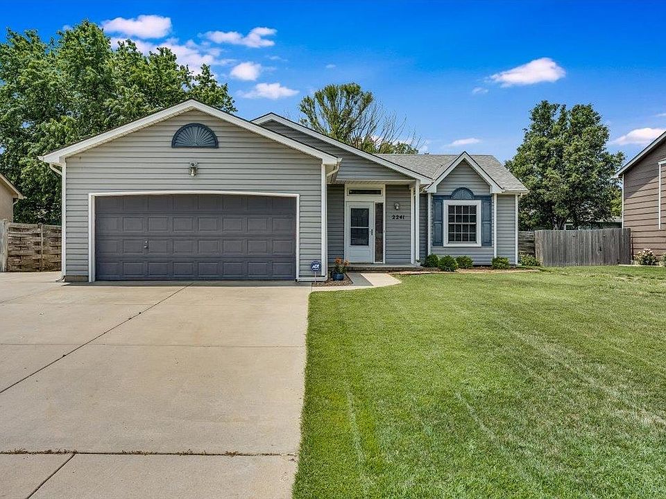 Welcome to this stunning 3-bedroom, 3-bathroom home located in the highly sought-after Goddard school district. With exceptional curb appeal and a prime location, this property offers a perfect combination of style, comfort, and convenience. As you approach the house, you'll immediately notice the attractive, low maintenance vinyl exterior and the convenience of the two-car garage with additional parking spaces available for an RV or any other vehicles you may have. Step inside, and you'll be greeted by a warm and inviting living room featuring vaulted ceilings and beautiful laminate wood floors. These elegant floors extend throughout the kitchen, dining area, and hallways on the main level, creating a seamless flow throughout the home. The island kitchen is a chef's dream, offering solid surface countertops and an eating bar for quick meals on the go. It boasts a full complement of stainless steel appliances that will remain with the home, ensuring a modern and functional cooking experience. The primary bedroom is spacious and luxurious, featuring a huge walk-in closet and a spa-like en suite bathroom. Pamper yourself in the corner soaker tub or enjoy the glass-enclosed shower. The double vanity with granite countertops and frosted glass door panels adds an extra touch of elegance. Both main floor bedrooms have recently been upgraded with new carpeting, ensuring comfort and coziness. The basement of this home provides even more space for entertainment and relaxation, with a generously sized family room. Additionally, you'll discover a sizable third bedroom, a large utility room, a separate storage area, an office, and a push-out area that presents an opportunity for a future wet bar. The privacy-fenced backyard is perfect for outdoor activities and features a convenient concrete patio just off the kitchen and dining area. Enjoy hosting gatherings or simply unwind in this peaceful outdoor space. There is also a practical vinyl storage shed for all your storage needs. With quick access to K54, this home offers an easy commute to various areas of town, ensuring you can enjoy all the amenities and attractions the area has to offer. Don't miss out on the opportunity to make this magnificent home your own. Call today to schedule a viewing and experience the charm and beauty of this exceptional property.