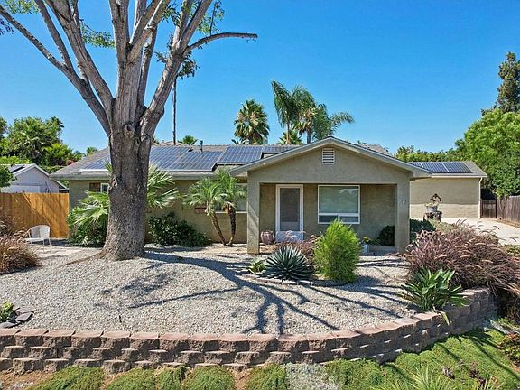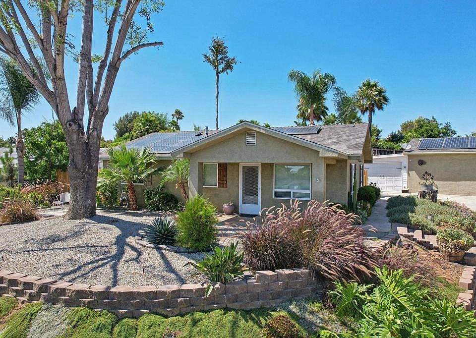 Come enjoy evenings in the garden at 'The Monarch House!' This Fallbrook single-story charmer brings you a quaint haven for privacy and updated living. A smartly designed 3/2, PLUS a completely remodeled and redesigned 500 sq. foot ADU with bath and kitchen. The main home boasts an updated kitchen with plenty of natural light and great storage. The floor plan flows seamlessly into a great room that is perfect for entertaining. Nicely sized en suite primary bedroom and two good-sized secondary bedrooms round out this Fallbrook gem. U/V privacy treatment on all east and west-facing windows allow for more efficient climate control throughout the home, while wood and tile flooring help keep things cool and low-maintenance. The house sits above a long, elevated driveway, helping to bring those evening breezes while providing a greater sense of privacy. The 'Monarch House' is pet-ready with new fencing in the backyard and side yards plus updated fencing on the west side of the property. 48 Solar Panels provide clean energy year-round, helping to keep utility bills low. Great storage and possible workshop potential in the approximately 12 x 6 x 7 Tuff-Shed in back. An EV outlet installed in the garage provides for convenient at-home vehicle charging. The ADU is the perfect place for guests or instant income potential, offering a comfortable 'studio' layout in a stand-alone building. Low maintenance, water-wise landscaping graces all sides of the property with an established pecan tree providing shade. In addition to the established front yard pecan tree, the 'Monarch House' boasts a nice orchard selection, including fig, pomegranate, Morro blood orange and Meyer lemon trees as well as yellow and purple passion fruit vines and large container-grown artichokes. This is truly an eco-friendly oasis in the community, and the home is also registered on moarchwatch.org as an official Monarch Butterfly migration way station. A unique and special Fallbrook home you could call yours!