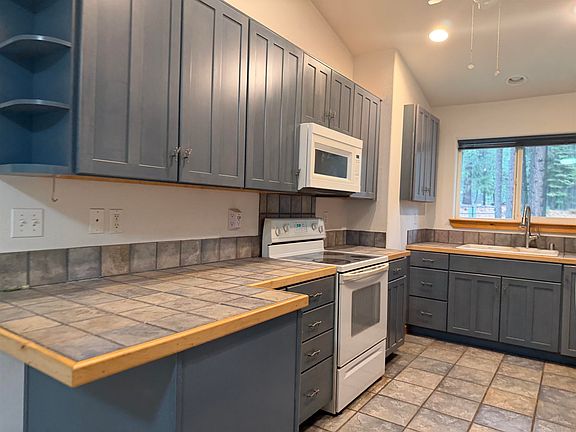 Large picture windowsWalk in closetCovered patioGalley style kitchenElectric rangeSpacious primary bedroomVaulted ceilings