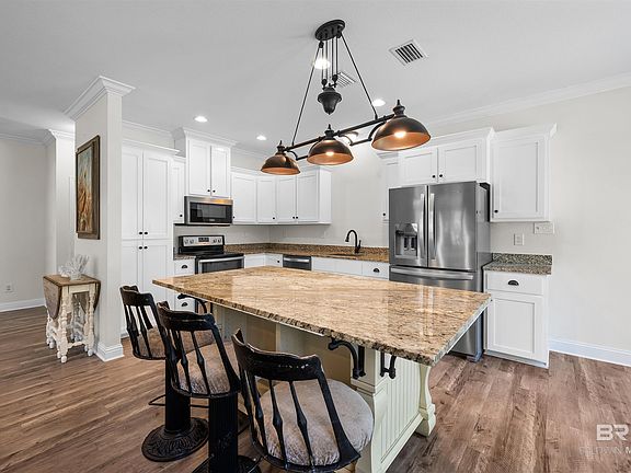 Make your dream a reality in this Southern style waterfront home, with privacy and space for all your toys and still close to everything! This picturesque 4-bedroom, 2-bathroom home nestled on Portage Creek, offers deep water access to the Intracoastal Waterway (ICW), just north of the Wharf Set on a large private lot, the property provides plenty of outdoor space for relaxation and entertaining, with a covered front porch, large outdoor pavilion, covered boat dock, fish cleaning station, 25,000 lb boat lift, and detached shed for extra storage. Inside, you’ll find an open floor plan, complete with a wood burning fireplace and LVP flooring throughout the main living areas and bathrooms. The kitchen features all stainless-steel appliances, granite countertops, and a large moveable island. Enjoy the best of both worlds with the privacy of nature and the convenience of city living—just 5 minutes from Pelican Place with Publix and Target, The Wharf for shopping and dining, and only 15 minutes from the Gulf of Mexico. Recent updates include an all-new boat dock, pier, and pavilion with IPE decking (2022), all-new bulkhead (2022), and fresh interior and exterior paint (2024). See map in pictures for route to home. Apple maps does not take you to the correct location, but Google maps does. Buyer to verify all information during due diligence.