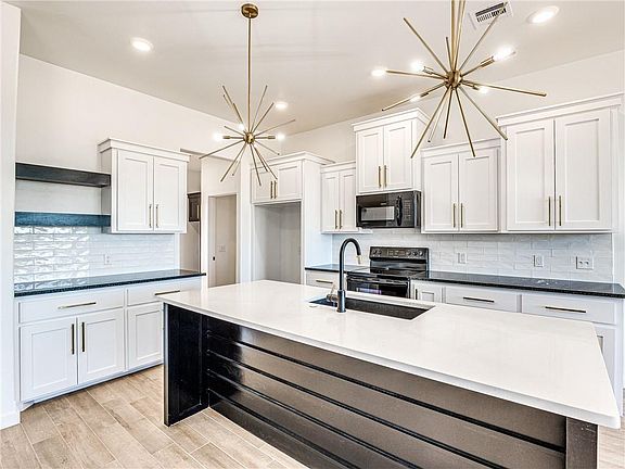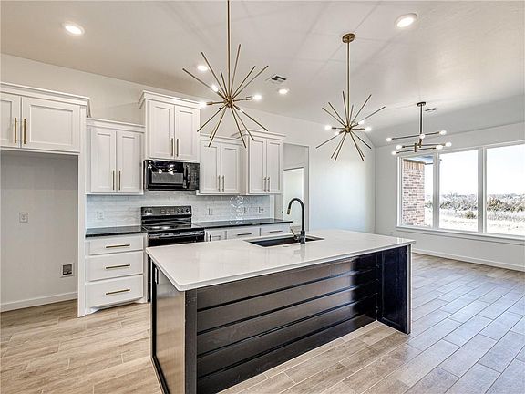 creating a modern, luxurious vibe. Stunning details include a sparkling kitchen with custom island, custom quartz and granite countertops, floating shelves, and a large walk-in pantry. The eye-catching designer fireplace is great for relaxing or entertaining. Master suite includes a large walk-in closet with wrap around laundry room access, built-in dresser, shoe cubbies, dual vanity sinks, quartz countertops, walk-in shower and a free-standing soaker bathtub. Garage has oversize doors fit for a large truck. All of this and more on a beautiful, quiet 1.33 acre with easy access to Norman, OKC, and more. Shops are welcome!