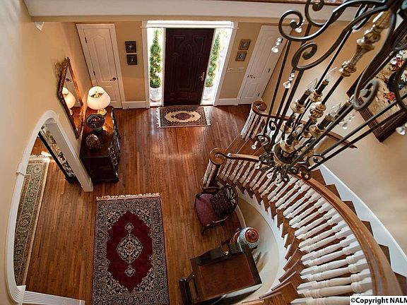 This magnificent home offers breathtaking views of Huntsville year round. Living space abounds in this 4 bedroom/3.5 bath beauty. This home has been a one owner and meticulously cared for with lots of love. Everyone will feel right at home walking into the foyer with soaring ceilings and spiral staircase. The formal living room has warm fire place and oak hardwoods. Beautiful oak flooring flows through downstairs living space and into the stately kitchen with lots of gorgeous custom cabinetry, granite countertop, and large island. Heavy molding in formal dining room. All wood molding in den was cut from trees when lot was cleared. Master suite downstairs. New HVAC and roof in 2016.