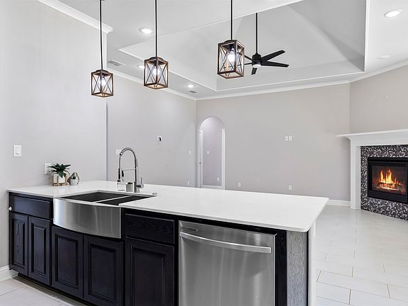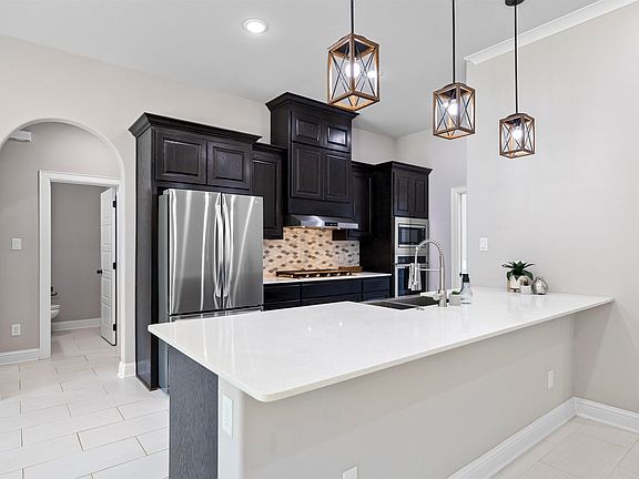 Come and see this beautifully maintained 2,008 sq. ft. home! This property includes 4 bedrooms, 2.5 baths, a 2-car garage, an open floor plan, and versatile living space, on a spacious lot that backs up to a serene wooded area. The modern wrought-iron front door and simple landscaping enhance the home’s curb appeal. Inside, the home features a clean, modern aesthetic with light, neutral tones and large windows that allow natural light to fill the space. The living room features elevated tray ceilings, light tile flooring, and an open layout that creates a warm yet expansive atmosphere. Unwind by the tiled fireplace or entertain with ease in the eat-in kitchen, which features quartz countertops, a stainless farmhouse sink and appliances, rich wood cabinetry, a gas stove, abundant counter space perfect for large gatherings or seating, and a spacious pantry. The split floor-plan ensures privacy for both you and your guests. The primary suite serves as a peaceful retreat with raised tray ceilings, plush carpet, a large walk-in closet and double doors that open to a luxurious bathroom with dual vanities, jetted tub, walk-in rainfall shower with multiple jets, and a water closet. Three comfortable guest rooms, each with plush carpet, abundant natural light, and spacious closets, share a guest bathroom with a shower-tub combo and a skylight. The half bath features a charming pedestal sink and storage cabinets. The laundry room includes a washer and dryer and features mudroom-style built-ins. A quiet home office with French doors offers the perfect space for remote work while staying connected to family. The expansive backyard is fully fenced for privacy and includes a playground for children. This home also features energy-efficient solar panels, reducing your utility bills while promoting sustainability- Solar panels will be paid off at closing! Oasis South residents can enjoy access to the community park, basketball courts, and picnic pavilion. Schedule your visit today!