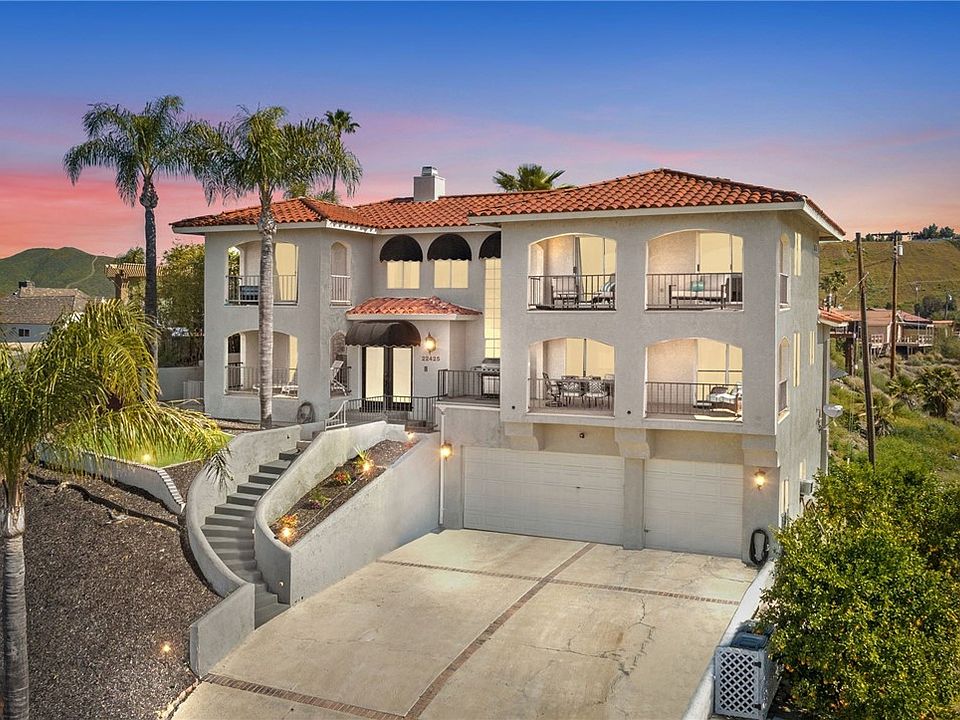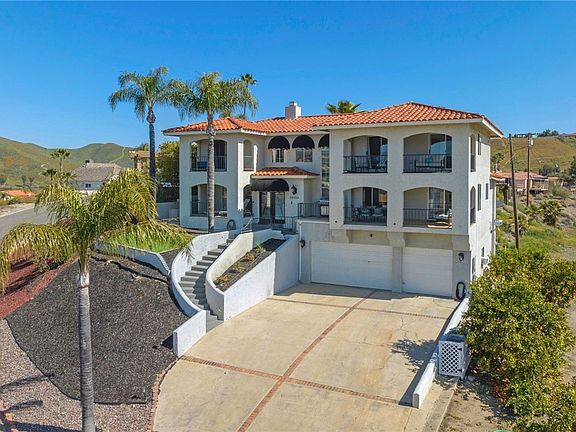 MAIN LAKE VIEWS!! This modern style 3 bedroom, possible 4 bedroom, 2.5 bath, 2358 sq. ft. home is located on what's known as the most prestigious street of Canyon Lake with views from almost every room and mesmerizing views from all the bedrooms. There are 4 private covered balconies, REAL 3/4" hardwood floors, dual A/C units, crown molding with up lighting and ceiling fans in every room. Enter through the custom double glass doors and a up a few steps up to the living room that shares a double sided fireplace with the possible 4th bedroom. This large room with double sided pocket doors works well as an office or game room and has it's own private balcony. The kitchen is open to the dining area and boast white soft closing cabinets, quartz counter tops, an island with seating, a Thermador cook top, built in appliances and nice water views. The extra large laundry room with plenty of storage and a sink, along with a half bath to completes the first floor. Upstairs you'll find the primary suite with a walk in closet and private patio which is perfect for morning coffee and enjoying amazing lake views. The en-suite bathroom has dual sinks, a step in shower and separate heated jacuzzi bathtub. The 2 secondary bedrooms are good sized and share another private patio with stunning views of the main lake. The hall bathroom also has a heated jucuzzi tub. The huge, flat, fully fenced backyard has turf grass and plenty of room to add a pool. With a 3 car oversized/extra deep garage, with additional storage and ample parking spots in the driveway is exactly what you need on a street with limited parking. The lot next door will never be built on either! Canyon Lake is a 24 hour guard gated community with a private 525 acre lake, premiere wakeboarding and waterskiing, 18 hole SCGA rated golf course, Lakefront pool, Equestrian center, tennis & pickleball courts, baseball fields, beaches and parks and so much more!