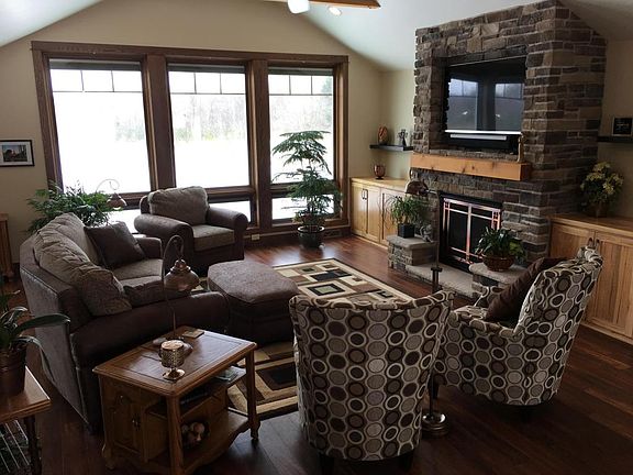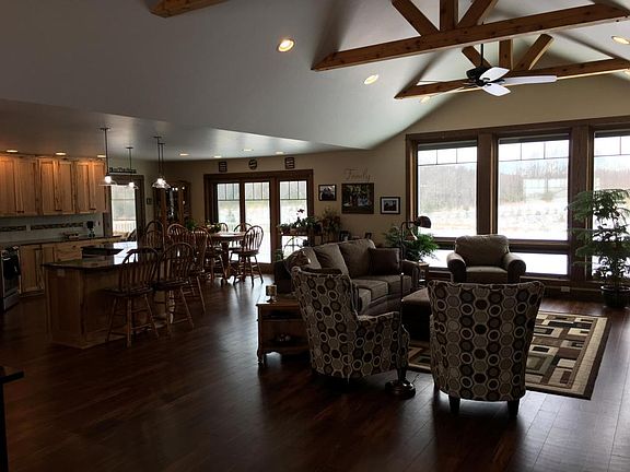 WOW!! A Dream Home, your dream, many dreams!! This home has ''everything'' you can imagine. Theatre room with rec area/bar area. Master bedroom with walk in closet along with master bath with walk in shower/handicap accessible with separate copper tub. Two bedrooms downstairs with another full bath. Large office. Walk out basement with patio under deck. Guest home. Pole building. Geothermal, in floor heating (basement). 3.5 car garage. Huge pond full of perch, bass, crappie. 15 acres included with sale of home. This one is the one you have been waiting for!! All Info per seller