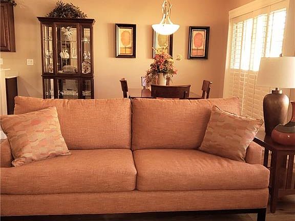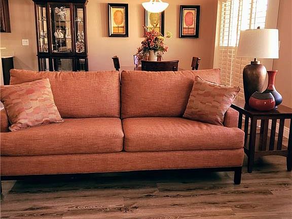 This popular Whitney model is well maintained, clean and MOVE IN ready with beautiful wood flooring, new cabinets, plantation shutters and ceiling fans throughout. Bright and airy great room, spacious island kitchen and 2 large bedrooms plus an office/den. Large, fully fenced yard with covered patio and impeccable mature landscaping. Brand new water heater. Washer/dryer and refrigerator included! Owner is willing to sell furniture outside of escrow. Enjoy all the benefits of the Solera Clubhouse including pool, exercise equipment and community activities