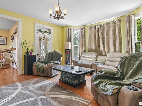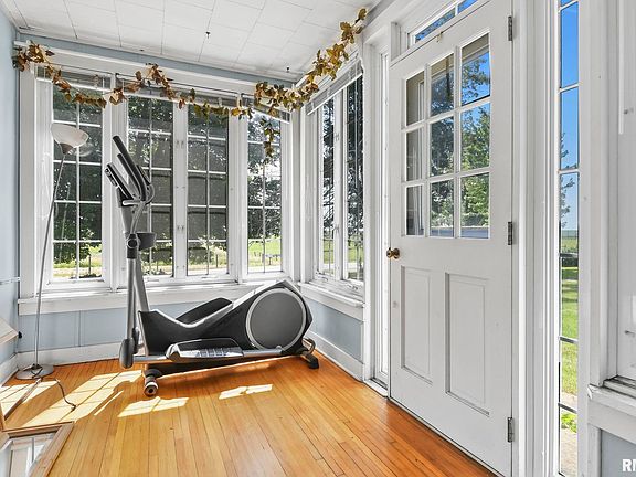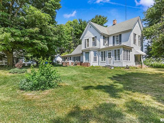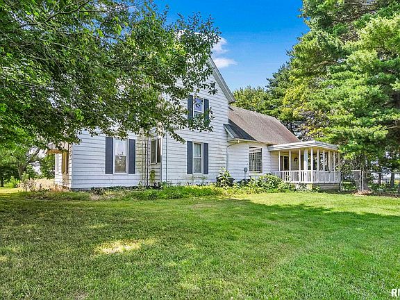 Prepare to be enchanted by this charming farmhouse! Situated on a sprawling 5acres just minutes from Jacksonville or Springfield, this beautiful residence has been loved & maintained by the same family for the last 18 years. Multiple porches adorn the exterior, providing perfect spots to soak in the serene surroundings. Step inside to formal living areas generous in size with intricate woodwork in the trim & built ins. Beautiful hardwood flooring leads through huge formal dining & living rooms adding another touch of timeless elegance. Tasteful updates perfectly finished in the kitchen and both bathrooms ensure modern comfort and efficiency. The kitchen showcases breakfast bar seating with modern countertops & backsplash, combined with high end stainless appliances and ample quality cabinetry. The upper level hosts all three XL bedrooms (true farmhouse style) in this classic yet practical layout. On the grounds you'll find a pond, sizeable 50x100 machine shed, two empty grain bins plus garage & sheds to meet all your storage & yard maintenance needs. Experience the perfect blend of vintage farmhouse beauty with contemporary design AND all the right updates in this delightful property in a prime location.