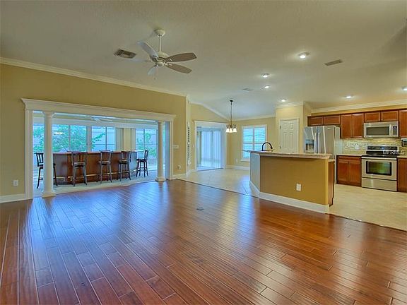 GORGEOUS IRIS Designer w/1965 sq ft in the Village of BUTTONWOOD. This home offers BEAUTIFUL curb appeal w/indigenous shrubs, stacked rock walls, and painted driveway. Enter through leaded glass front door into the foyer w/FABULOUS diagonal large tile, hardwood flooring in the living and dining room; look up and notice the STUNNING crown molding throughout the home. The kitchen has enhanced upgraded CHERRY cabinets, GRANITE counters, UPGRADED STAINLESS appliances, smooth top electric range and French door refrigerator, closet pantry and a wine rack! From the casual dining area and living room step down to your BONUS room with FABULOUS bar - it even has a refrigerator! GREAT AREA FOR ENTERTAINING! Notice the PRIVACY wall in your backyard and remote awnings for added shade. The master bedroom features a tray ceiling, large walk-in closet, en suite master bath w/tiled WALK-IN SHOWER, his/her sinks, GRANITE counters, a vanity, pocket door to separate commode area and linen closet. There is a pocket door in the foyer that leads to the guest bedrooms and guest bath. The spacious front bedroom has a vaulted ceiling, large window w/PLANTATION SHUTTERS and closet--the guest bath features GRANITE counters with tiled shower/tub. The laundry room features extra cabinets, a large sink and HIGH END LG TOP LOAD WASHER/DRYER! There is a 2-CAR+GOLF CART GARAGE w/pull down stairs to the attic & insulated door. This home oozes CLASS all the way. Call today to see this EXQUISITE home - you won't be disappointed.