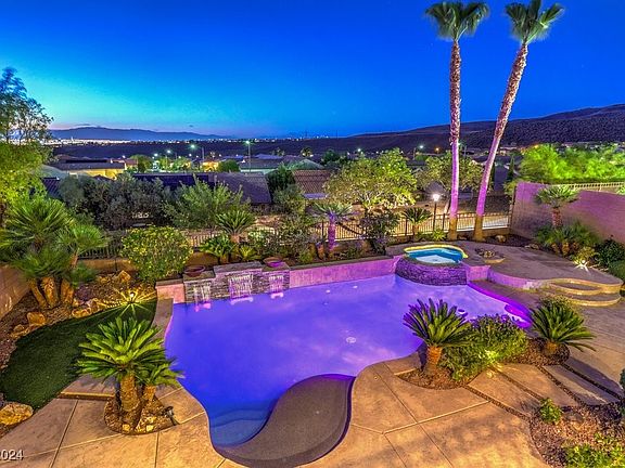 Highly-upgraded home on a desirable elevated view lot in The Club at Madeira Canyon, a guard gated lifestyle community. Picturesque views of the Las Vegas Strip, city lights, and mountains are prominent throughout the interior and exterior of this wonderful home. Backyard oasis highlighted by a pool and spa, waterfalls, outdoor kitchen, manicured grounds, putting green, sweeping views, and magical sunsets. Home is finished with expert craftsmanship, new contemporary paint, new carpet, stone pattern tile, crown molding, and Hunter Douglas shades. Chef inspired kitchen treated to granite counters, top-tier cabinetry, mega island, nook, desk area, and Monogram stainless-steel appliances. Family room set just off the kitchen creates an ideal space to relax or entertain thanks to the soaring ceiling and perfectly placed windows allowing natural light to pour in. Primary suite is conveniently situated on the first floor offering a restful feeling, spa inspired bathroom, and walk-in closet.
