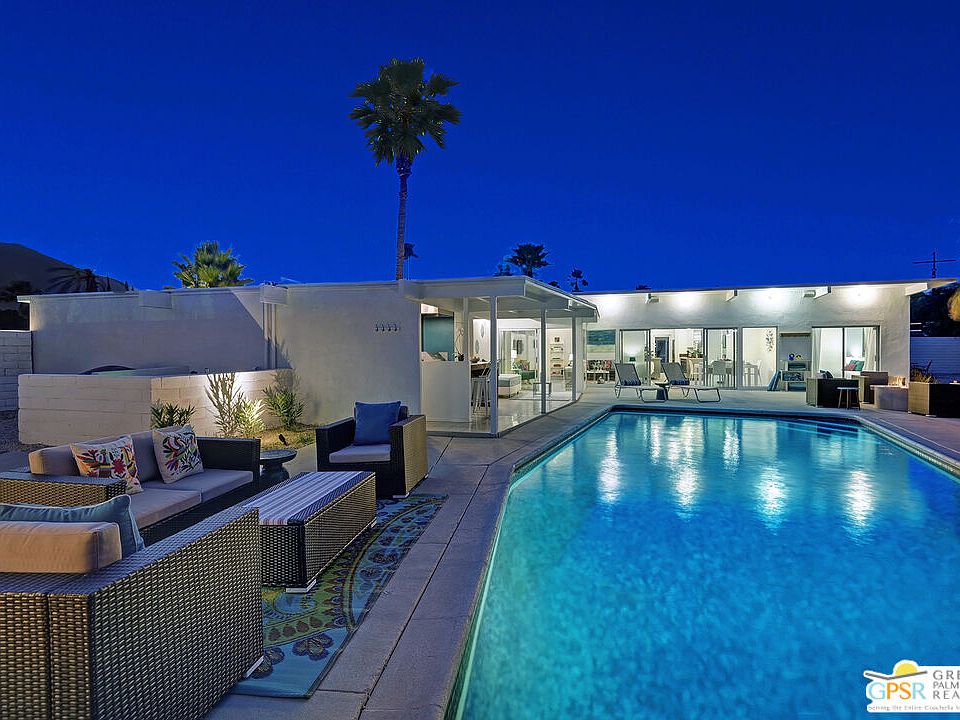 Discover the allure of this remarkable Meiselman-designed mid-century gem nestled on a serene cul-de-sac within the iconic Racquet Club neighborhood. Offering 3 bedrooms and 2 baths, this home comes fully furnished and is perfect for you to embrace the coveted Palm Springs lifestyle from day one. Marvel at the panoramic mountain views through the clerestory windows while the sun-drenched living room, facing south, bathes the space in natural light throughout the day. Step outside to your own private sanctuarya backyard reminiscent of a boutique resort, complete with a pristine tiled pool, a spa, and covered BBQ/dining area, perfect for entertaining or peaceful relaxation. Inside, discover a well-appointed modern kitchen strategically positioned between the primary suite and guest quarters, ensuring privacy for all. Additional highlights include a spacious 2-car garage with laundry facilities, offering ample storage. Despite the Racquet Club's rental density currently exceeding 20 percent, this property allows for up to six short-term rentals annually, along with numerous longer-term options, subject to a junior permit. Reach out to the agent to schedule your exclusive tour and experience the magic firsthand.
