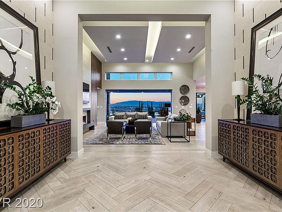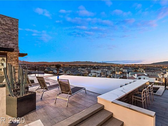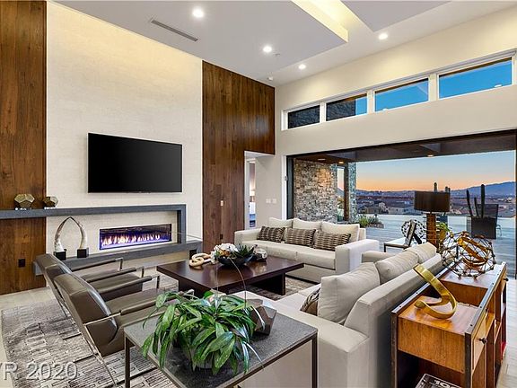 Former model home exquisite luxe living in a one-story desert contemporary hideaway in The "Axis" community complete to the tee with ALL of the builder's upgrades on the neighborhood's premier lot w/completely unobstructed views of the Las Vegas Strip! Entry invites you to an expansive open concept living room leading to disappearing pocket doors into an entertainer's ultimate dream backyard featuring an infinity pool/spa, patio deck w/poolside bar, built in entertainment center w/outdoor TV, and much more. Kitchen features huge leathered granite island, Gaggenau stainless steel appliances, quartz counters, wine fridge, walk in pantry, and soft close cabinets & drawers. Complete movie theatre including surround sound, brand new projector, custom lighting, seating, and wet bar w/wine dispenser. Dazzling master bedroom overlooks Las Vegas strip and leads directly to spa. Home temperature, pool, lighting, audio, video/security through out home all compatible to smart phone.