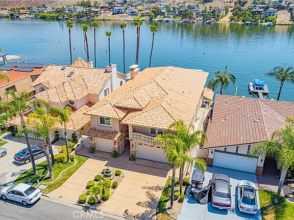 "Main Lake" Waterfront in the "Best Kept Secret of So Cal". Captivating and expansive water views of the lake, with east facing exposure. Unique and Wonderful Estate, 2 Expansive outdoor decks on the water with well planned outdoor space. The rear yard offers a grass area for bocce ball or room for a pool along with a tile covered lakefront gazebo. Ultimate Luxury with approx 4500 sq ft, 5 bedrooms all with their own bathroom and drawers in the closets. Movie Media theater to entertain all ages. Sunken wet bar with refrigerator and lake views. Ideal open floor plan offers flexibility for entertaining flowing to the bright & airy outdoor covered deck. Equipped w/Surround sound system. Kitchen is a true chef's delight, Large Island with granite and 2 sinks, double ovens, warming drawer, lots of Maple cabinets, and a breakfast bar. Main floor guest bedroom with attached bath, and an elevator in the hallway. Gorgeous staircase leading upstairs to 3 en-suite bedrooms and the grand Master bedroom. Feel like you are at the spa. Highlighted with marble and fabulous large closet lined in cedar. Plantation shutters and fans throughout. More fun with the game room, shoot some pool, or relax on the upper deck. Sold fully furnished per inventory. Desirable U-dock, lift and covered Canopy. Rare opportunity for this custom home on a cul-de-sac street, 3 car garage, w/plenty of parking. Views of the mountains, landscaped front and rear. Ready to move in. Quality throughout. . Tons of storage under the deck. Sit for hours and watch the boats go by with your amazing views, offering tranquility and room for large parties and family. The Ultimate Getaway.