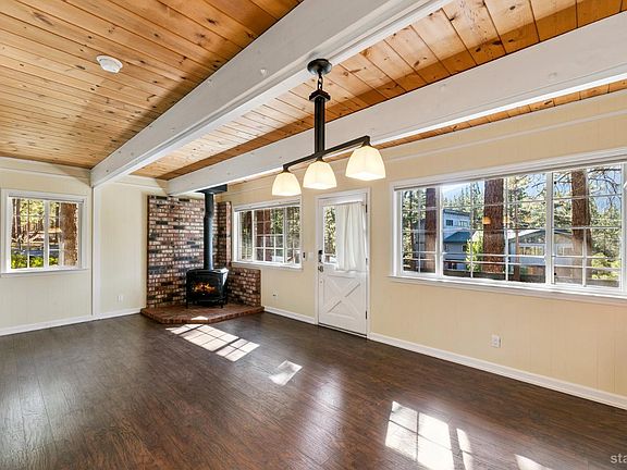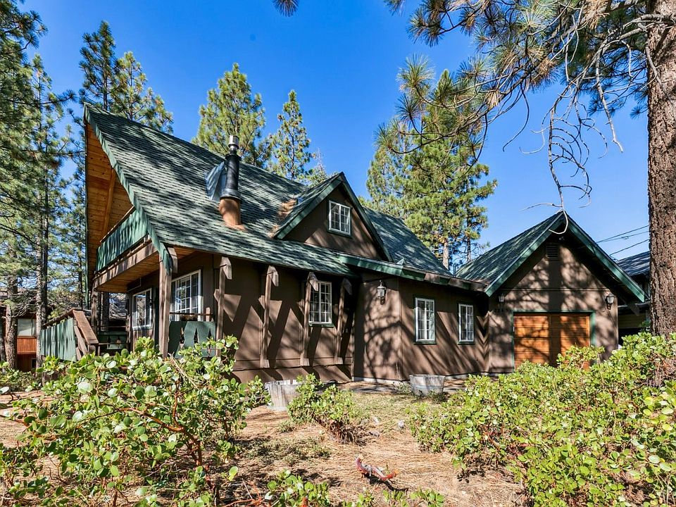 Well-maintained chalet in the desirable Montgomery Estates area, offering the perfect mountain retreat on a 14,159 square foot lot. Positioned at the top of Cold Creek, this property provides easy access to miles of hiking and biking trails with filtered lake and mountain views.The living space features open beam ceilings, laminate flooring, and a cozy gas stove that creates the ideal atmosphere for mountain living. The main level includes a bedroom and full bathroom, providing convenient single-level living options.Upstairs, you'll find two additional bedrooms, each enhanced with open beam ceilings and private balconies that frame beautiful filtered lake and mountain views. The partially updated bathroom on this level features a newer vanity with quartz counters and modern fixtures.This three-bedroom, two-bathroom home is 1,236 square feet and represents an great opportunity to own a piece of mountain paradise. The generous lot size offers plenty of space for outdoor activities, while the established Montgomery Estates location provides both tranquility and accessibility to area amenities. Whether seeking a primary residence or vacation getaway, this chalet combines rustic charm with modern comfort in one of Tahoe's most sought-after neighborhoods.