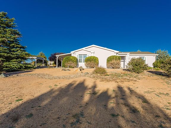 This absolutely stunning & immaculately cared for triple wide boasts an open & spacious split bedroom floor plan with a great room design concept, single level living, no restrictive HOA, a paid in FULL (leased) solar system providing low utility costs & it's all on an over 2-acre equestrian property with elevated, rolling topography & fantastic panoramic views of Granite Mountain and the surrounding vistas! Walk under the front pergola covered entry & you are welcomed by an interior that features vaulted ceilings throughout, a wood burning fireplace, surround sound wiring, a nest thermostat, decorative plant shelving, upgraded plantation shutters throughout, raised panel doors & ceiling fans throughout. CONTINUE