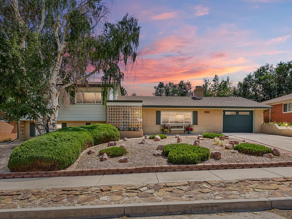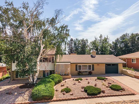 Custom built in 1957, this unique home has mid century modern written all over it. Walk in to an Italian marble entryway, large sunken living room with wood burning fireplace and huge picture window looking at Pikes Peak. A formal dining room with built-ins attaches to the great room, living room and kitchen. Enter the back of the home where the original owner who loved to entertain built a stunning great room. Equipped with a bar, gas fireplace, built in shelving, and walk out to large back patio, this room is an incredible place to entertain. Step into the basement for a guest suite with full bathroom, cozy TV room and a rec room for an office or workout space. This room is wrapped with windows that allow all that Colorado sunlight in. Upstairs you will find 3 bedrooms and a nice large renovated bathroom all with original hardwoods. The home has been in the same family since it was built, pride of ownership is felt throughout. Very close to all of the Cities conveniences, and the open space of Palmer Park.