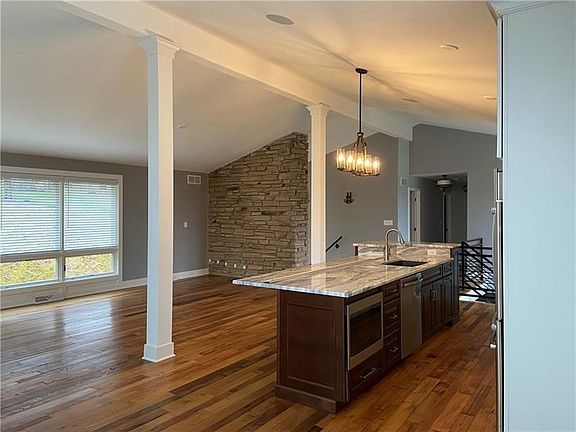 Fantastic opportunity to own this Open Concept Mid-Century Modern redesigned and remodeled house! The endless list of updates include: mechanicals, concrete driveway, stamped concrete sidewalk, 3 sided wrap around low maint. deck, new metal roof, vinyl siding, Pella windows, sliding glass doors with shades, custom wood blinds, custom railings, rare wormy chestnut hardwood flooring, wired for surround sound and security. Kit. boasts a lge center island with one piece granite top, dbl sink, soft close cabinets, 6 burner gas cooktop, dbl. oven, stainless appliances, lots of cabinets and lge. dining area. LR has a floor to ceiling stone fireplace w/ gas logs. Lower level is lge. with stone wood burning FP, wet bar, two additional bedrooms, full bath, laundry rm. Master BR on main floor with 14x10 walk-in closet, full bath w/ heated ceramic fl, awesome step in shower with 2 heads, dbl. sinks. 2nd bedroom and hall bath with ceramic floor on main level. This home is truly a must see!!