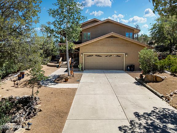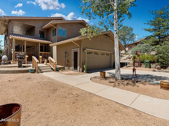 Talk about views!! This beautiful home sits at the base of iconic Thumb Butte and offers spectacular views of Prescott and the surrounding mountains. The top level, which is up the first half of the staircase from the entrance, is perfect for intimate gatherings in the beautiful kitchen around the island or out on the deck. On chilly winter nights you can cozy up by the fire in the living room and regale in tales of Prescott past. The owner has installed plantation shutters and brand new Anderson windows throughout and sliders off the dining room. The kitchen and dining room windows have remote control blinds for ease of use. The spacious owners suite with sitting area is located on this floor, along with an office or potential guest room. There is also an option to add a small elevator