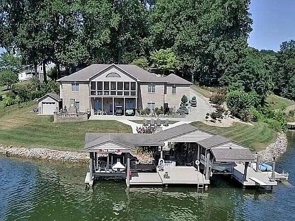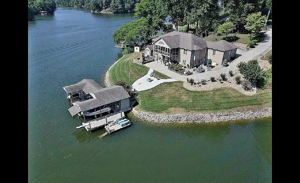 Immaculate Brick Lake Home situated on a Fabulous Point Lot with 500 /+feet of Shoreline! Gorgeous Southern Views, Huge Covered Dock, Fire Pit and Paver Patio with outdoor fireplace. Beautiful 180 degree views from the Large Screen Porch and lower level Patio. Great Room with Stone front fireplace, Large Kitchen with SS Appliances, Two Master Suites on the Entry Level, Lower Level Family room with propane heater, 2nd Kitchen and two guest suites. Concrete Driveway and whole house Generac Generator (new), Storage Shed and Detached workshop garage on lower level exterior. Xfinity available at Road.