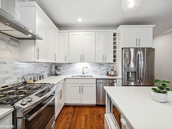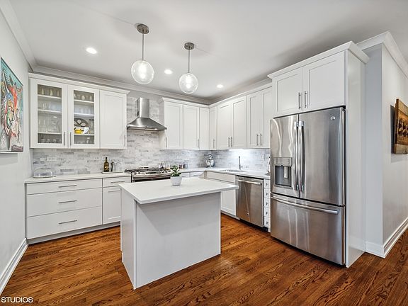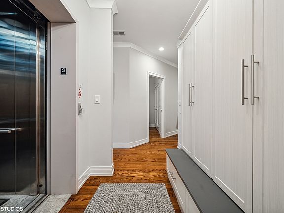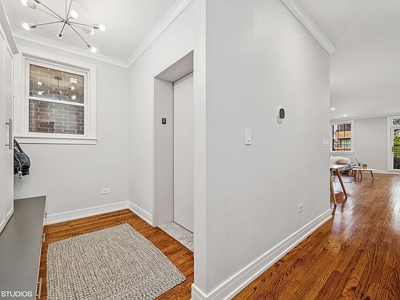Stunning updates in this spacious, 3 bedroom, 2 full bathroom condo in the heart of desirable North Center neighborhood located in acclaimed Bell School District! No detail spared in this recent renovation! Building is secure with a keyed elevator, with the entrance opening up directly into your unit. Light pours into your living space with gleaming hardwood floors, neutral paint, TONS of storage, and crown molding throughout. Entryway has custom built mudroom with adjacent coat and an additional hall closet which could easily be used as a linen closet or pantry! Kitchen boasts abundant white shaker cabinetry, white quartz countertops, island with breakfast bar seating space, custom marble backsplash, built-in wine rack, high-end stainless steel appliances, and opens up to your open concept floorplan - perfect for entertaining! Separate designated dining area connects seamlessly with the kitchen and living room with tons of windows and access to large covered balcony! The spacious primary bedroom boasts 2 walk-in closets, access to the 2nd (back) balcony, has plenty of room for that king-sized bed, and has a gorgeous en-suite bathroom featuring a white cabinet vanity with quartz top, and tub/shower combo with custom tile surround and dual water sources. You can also access the 2nd (back) balcony from the main hallway. 2 additional bedrooms which can easily be used for guests, playroom, and/or an office space have large closets and convenient access to the 2nd full bathroom. In-unit washer/dryer. The unit comes with 2 parking spaces: assigned and gated, for easy access. Tons of storage throughout including an extra storage unit in the garage. You are just steps away from Paul Revere Park, Northcenter Town Square, Irving Park Brown Line, restaurants, coffee shops, nightlife, shopping, farmers markets, and more. The desirable Bell School is less than a 10 minute walk from your home! Your search ends here!