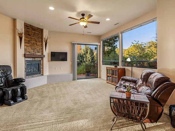Centrally located in West Sedona, this newer contemporary home offers move-in condition, one level living and a split bedroom floor-plan. Snowbirds, downsizers, retirees, families - everyone and anyone - will appreciate and enjoy the simplicity, tall ceilings, stone fireplace, walk-in shower, stainless steel appliances, private back yard, 2 car garage and other amenities this home offers. Sit in your backyard around the firepit an watch Thunder Mountain glow. 30 Day Minimum Rental.