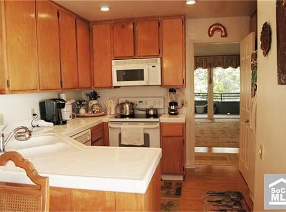 Great upgraded home,with 3 bedrooms & a den/office,direct access to garage with washer & dryer hook ups, gated entry to carport or patio. largest floorplan main floor bedroom with mirrored wardrobe doors, custom window coverings & nice private location. Nice & bright kitchen with tiled counter tops, remodeled nice cabinets, Separate breakfast nook with recessed lights, wood floors, ceiling fans, spacious living room with wood floors, custom window coverings,recessed lights, sliding doors to balcony with trees & greenbelt views, tiled floors at bathrooms, skylights,close to schools, shopping & restaurants, HOA has 3 pools, spas, clubhouse, tennis courts & parks. Shows nice, bright & nicely upgraded