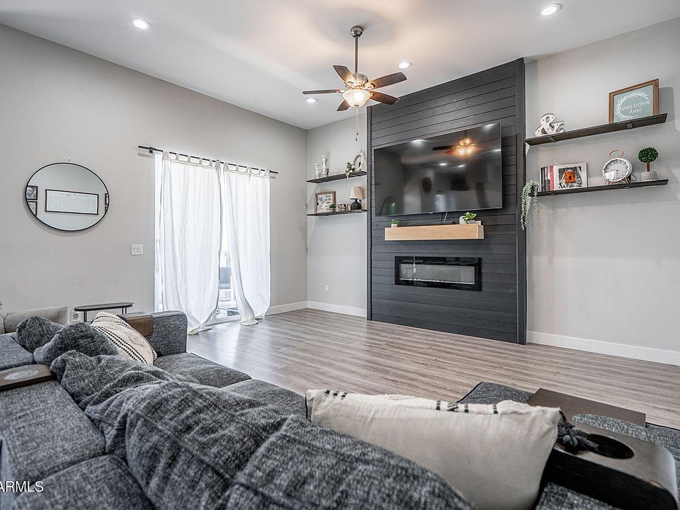 Covered patioShaded patioElectric fireplaceEpoxy floorsOpen-concept livingLow-maintenance synthetic turf backyardSoaring ceilings