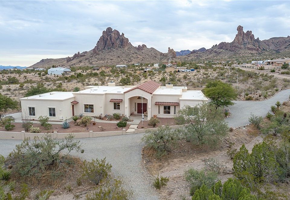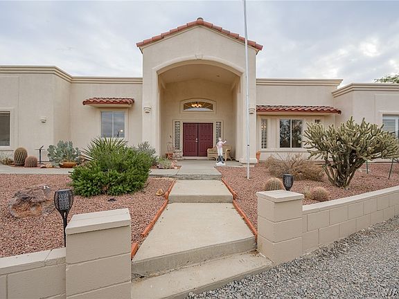 Nestled at the base of Mount Nutt on 4.6 fenced acres this custom build 3 bedroom,2.5 bath, 2885 square foot home is sure to please. Inside amenities included, oversized master bedroom with jetted tub, fireplace and private patio, guest bedroom with private entrance and attached bathroom, 3rd bedroom has custom built in cabinetry and desk. The living room features another fireplace, pool table and wet bar with refrigerator. The all-electric kitchen has a huge island and mountain views front and rear. Laundry room includes washer and electric dryer with sale. The covered rear patio is sure to amaze with incredible panoramic mountain views, roof top observation deck and low maintenance landscaping. Need storage? Rear utility room, 2 standalone storage sheds, and 7 total garage spaces. The detached 4 car garage is pre plumbed for toilet and 2 sinks. RV hookups with dump station is ready for weekend visitors. 2 underground water storage tanks with over 3500-gallon total capacity, a freshly serviced well, septic and newly coated roof, fresh exterior paint is just some of the additional benefits that make this property a must see. Only 23 short miles to casinos, launch ramps, Lake Mohave and evening entertainment.