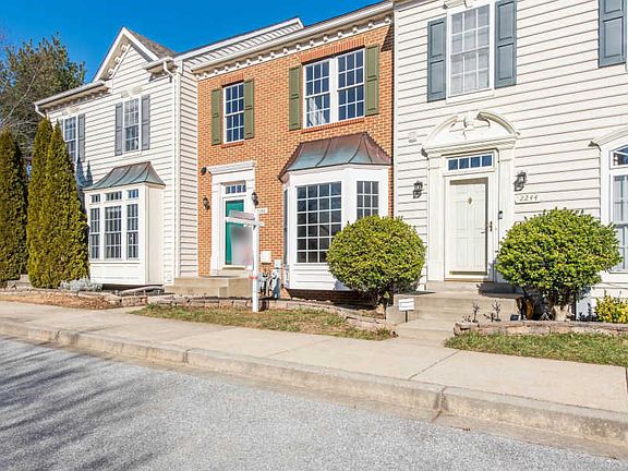 Upgraded brick front townhome in Waverly Woods is move-in ready! Met at the door by freshly painted interiors, you'll find a welcoming living room accentuated by a bay window, gleaming hardwoods, crown moldings and trim, and an open dining room with walkout access to the deck. Updated kitchen boasts an elevated breakfast bar, 42" cabinetry, sleek granite counters, tile backsplash, stainless steel appliances, and a bump out breakfast room brightened by transom topped windows and pendant lighting. A vaulted ceiling emphasizes the upper level owner's suite including beautiful hardwoods, a walk-in closet, a lighting ceiling fan, and a private bath. Both bathrooms upstairs are updated; new vanity light sets, towel bars, shower bars, and paint. Finished lower level features a rec room, bonus room, full bath, and a walkout to a stone patio and shed. Conveniently located, Marriotts Ridge high School!