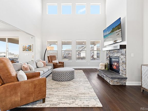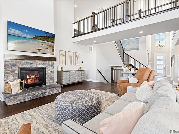Nestled in Parker’s highly desirable Idyllwilde/Reata North neighborhood, this high-end Toll Brothers home combines luxury, comfort, and serene surroundings. Perfectly positioned on a prime lot with mountain views, the property backs to open space, creating a sense of privacy and tranquility. From the moment you step inside, soaring ceilings, gleaming hardwood flooring, and exquisite details like crown molding and 8-ft doors add to the home’s grandeur. The impressive family room features a striking stone fireplace and flows seamlessly into the gourmet kitchen, designed for both everyday living and entertaining. Leathered granite countertops, upgraded cabinetry, stainless steel appliances with a range hood, a walk-in pantry, and a timeless backsplash create a stylish and functional space. Adjacent to the kitchen, the formal dining area provides a refined setting for gatherings and opens to the expansive deck, where you can take in the lush backyard and open space beyond. The main-floor primary bedroom is tucked away for privacy and features a spa-like five-piece ensuite and a spacious walk-in closet with custom built-ins. A dedicated main-floor office with French doors adds flexibility for work or study. Upstairs, three generously sized bedrooms include two that share a beautifully designed Jack and Jill bathroom, while a versatile loft offers additional living space for a media room, play area, or reading nook. The unfinished walkout basement presents endless possibilities, whether you envision a home gym, a custom entertainment space, or additional bedrooms. The large fenced backyard is beautifully landscaped, providing a private retreat for relaxation and outdoor enjoyment. Located just minutes from shopping, dining, and entertainment, this home offers a balance of seclusion and convenience. Thoughtfully designed with stunning features throughout, this home stands out as a true gem.