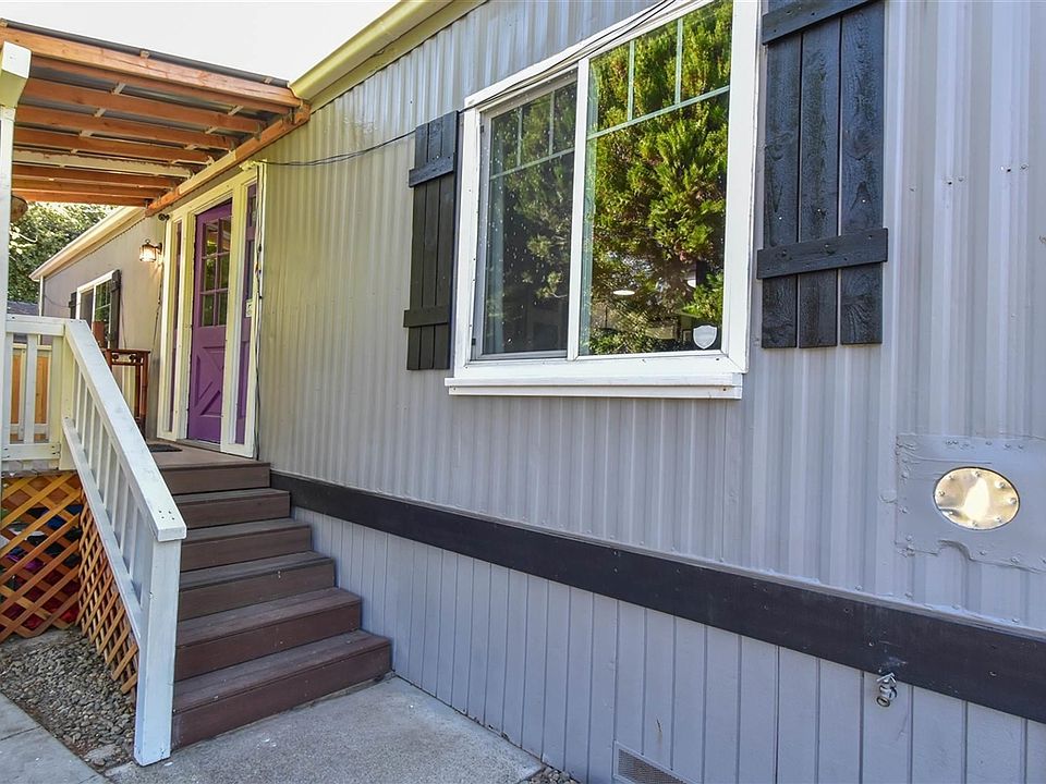 This is it! Super clean and updated home in an all age park. Park rent is 486 + sewer and water. New front and back deck, dual pane windows. Large workshop. New paint and gutters. Updated appliances, water heater and wood pellet stove. New waterproof laminate flooring and carpet. Newer roof. They've remodeled and opened up the living room and the kitchen. Great family space. Two parking spaces and a carport too. Since this is the front space you have a view of the open park area. Completely private landscaped yard with a waterfall with a pond and fish too. Park includes basketball courts, swings and laundry room. You must be qualify for the park before close of escrow.