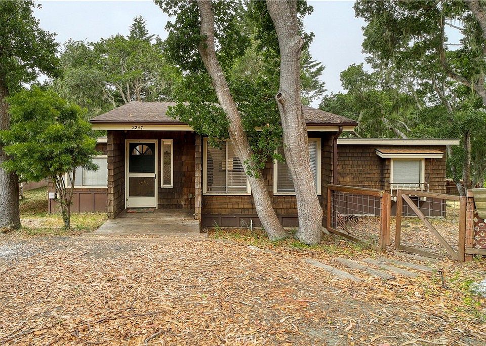 Wonderful opportunity live in the picturesque hills of Cambria. Situated on a huge 12,300 sq ft lot this charming 2 bedroom 2 bath home is ready for your remodeling ideas. Featuring over 1300 sq ft of interior living space including a formal dining room with large picture windows bringing in the natural light, and a pass through window to the kitchen. The living room features wood beamed ceilings, hardwood floors and a wood burning fireplace. The galley kitchen features an opening to the hallway adding light from the French doors leading to the back yard. The hardwood floors continue from the living room to the 2 bedrooms including the primary bedroom with en-suite bath. The oversized lot provides plenty of space to relax among the trees, gardening and even the potential to build a shop. Located just a half mile from the Trenton Entrance to the Fiscalini Ranch Preserve with great hiking trails, a mile from coastal access and just 2 miles from Downtown Cambria with great restaurants and shopping.