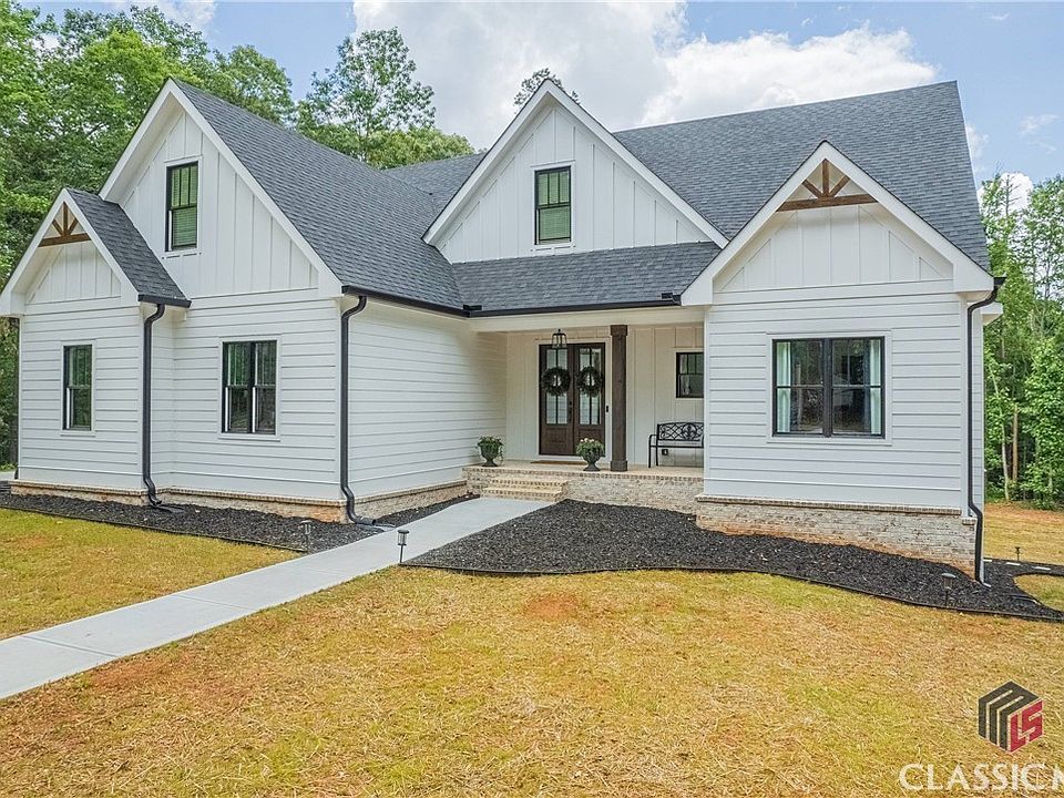 living/dining room, kitchen area that is well designed with custom features such as beams, ship-lap, 9' ceilings throughout, trey ceilings, 12' ceiling in living room and a custom built-in entertainment center that is great for every day living or entertaining. A beautifully designed kitchen has all stainless appliances, double oven w/ convection, 6 burner gas cook top, soft close drawers/doors, Quarts counter tops and a walk in pantry that has a prep sink/smoothie making station. The custom cabinets are abundant with a sizable island seating 4-5 bar stools. The covered back deck provides additional gathering space or simple relaxation at the end of a long day while soaking in the beauty of all the surrounding nature. Much wildlife is viewed and enjoyed when relaxing on the deck or looking out the many windows across the back of the home. Coretec 100% water proof LVP is throughout the main floor living with tile in the bathrooms. The split floor plan provides a private master bedroom/bathroom that ties directly to the closet and laundry area making it very convenient to wash and put away clothes. The basement is perfect for in-law living or other family members with its own separate drive and private exterior entrance that is complete with 2 bedrooms, a full kitchen, spacious gathering room and a second private laundry area that is located in the basement walk in closet. There is a great space that has been left unfinished in the basement, which is connected to the 4th bathroom, ready for your personal design and finishes. Sellers offer a $2,000 credit to buyers at closing to purchase and install a freestanding tub of their choice for the already plumbed space in the master bath. 25 year architectural shingles on the roof. Energy efficient spray foam insulation in the attic. Easy access to HWY 316, HWY 330 and HWY 129, 15 minutes to downtown Athens, 20 min. to downtown Jefferson, 3.5 miles to Sams club, 5.6 miles to Costco. Property is private and seen by appointment only. Owner/agent lic# 390860 *Credit based on the listed price.