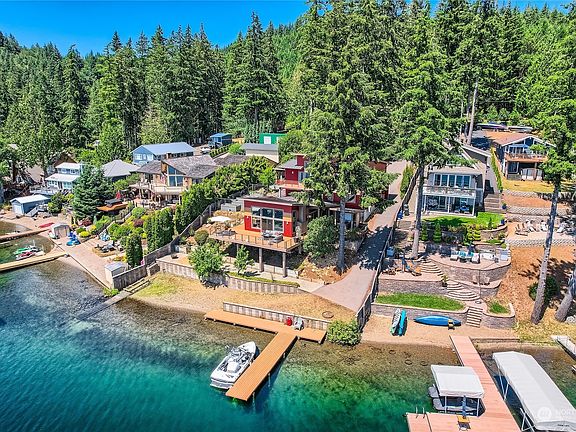 Experience unparalleled waterfront living at this stunning Summit Lake home, offering 100' no-bank waterfront & private dock. Enjoy water skiing, fishing & wildlife at your doorstep. Kitchen features alder cabinets, glass tile backsplash & granite counters. Leviton smart home system & Precision Lift elevator provide modern convenience across all 3 lvls. Wood & propane FP's, ceramic tile floors & ductless heat pump w/hydronic floor heating. Panoramic views from Trex decks, dock, patio & hot tub. Landscaped garden w/raised beds, roses & fruit trees. Features gravel & bulkhead beach, RV parking & 20kw diesel generator. 30x36 shop offers 14' & 12' doors & 3/4BA. 15 min. from Capitol Forest, Hwy 8 & W. Olympia. Don't miss this rare opportunity!