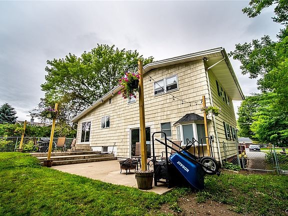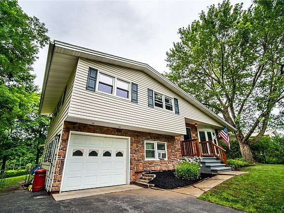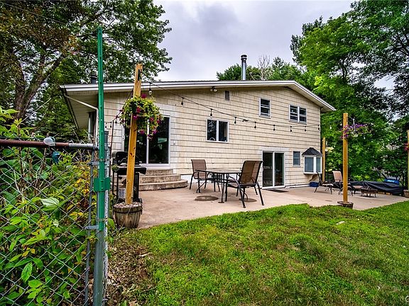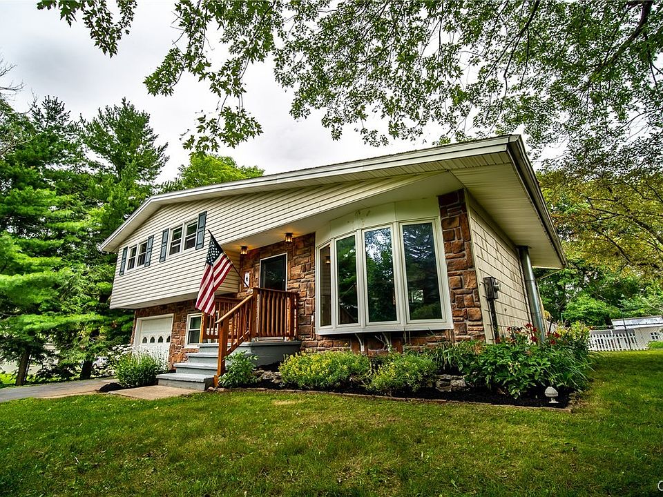 Charming 4 bedroom, 2 bath Raised Ranch w/attached 1 car garage with beautiful river views! So much to see upon entering into this open concept plan w/perfect flow! Upgraded Kitchen features black stainless appliances, counter bar w/seating, a big window over the sink for a great view, LVP flooring throughout & plenty of cabinetry for storage! Eat-In Dining Area w/custom light/fan fixture! Sliding glass doors provide access to back extended patio and beautiful back yard oasis featuring an updated shed, chicken coop, raspberry & blueberry bushes, a mini vineyard of red & white grapes and gorgeous views with your private access to the river w/kayak rack! Great Room features a beautiful large bay window for natural light and closet for storage! Living Room features a wood stove, custom ceiling fan/light and additional access to the extended patio! Master suite offers custom ceiling fan/light, great natural light, closet w/extra space! Secondary Bedrooms w/ceiling fans/light combos! Basement offers Laundry Space w/sink! Secondary Bedroom with natural light, carpet, custom ceiling light/fan combo and extra closet space! Full bathroom offers full tiled shower, custom light and storage!