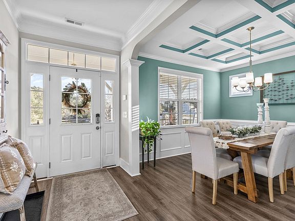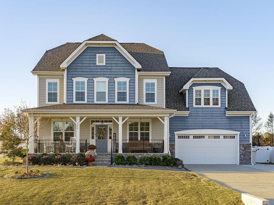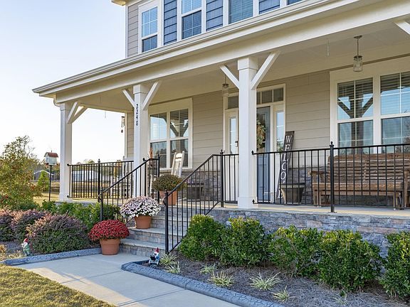 Incredible Beaufort Plan boasting 5 BR/4 Bath on a corner lot nestled between the amenities of two cities. This open floorplan features a formal dining room w/coffered ceiling, double sided fireplace warming a generously sized family room and sunroom filled w/natural light, gourmet kitchen w/granite countertops, dbl ovens, SS appliances & custom wine rack. This home features 9' ceilings, mudroom, office nook, 1st floor guest ste., & covered front and back patios with fenced in yard for added privacy.