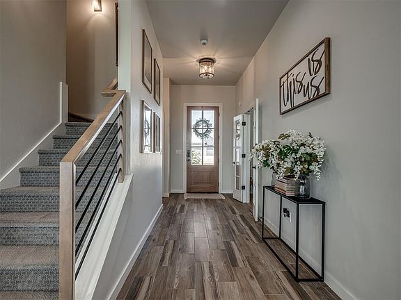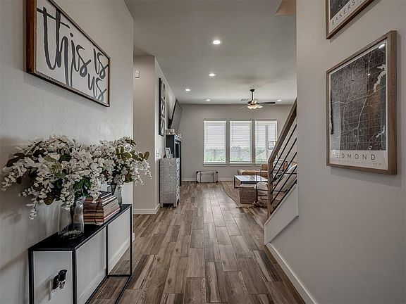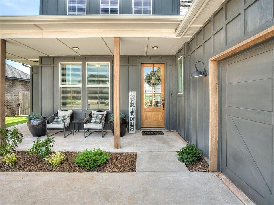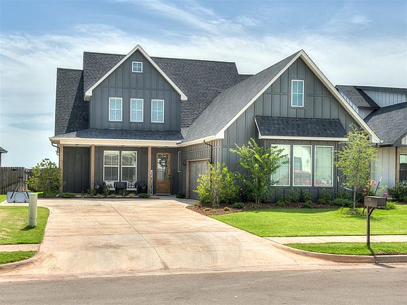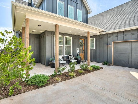 Welcome to your dream home in the coveted Covell Valley neighborhood of Edmond, OK! This stunning modern farmhouse-style residence offers the perfect blend of luxury, comfort, & breathtaking natural beauty. With 4 bedrooms, 2.5 baths, & a spacious 2,565 sqft floor plan, this home provides ample space for both relaxation & entertainment. Built in 2021, this home is practically brand new & boasts impeccable craftsmanship & attention to detail. As you enter, you'll be greeted by a cozy front porch that sets the tone for the warmth & charm that awaits you inside. The main level of the home is thoughtfully designed with an open-concept layout, allowing for seamless flow between the living, dining, & kitchen areas. The heart of the home is the chef's kitchen, complete with modern appliances, ample cabinetry, & a large center island. Adjacent to the kitchen is an inviting living room for relaxation & socializing. The primary suite, located on the main floor, is a true oasis. With a spacious bedroom that overlooks the serene greenbelt, you'll wake up to the sights & sounds of nature. The primary bathroom is a retreat of its own, featuring a luxurious soaking tub, a separate shower, & his-and-her closets for ultimate convenience. Working from home is a breeze w/the dedicated office space on the main level. Upstairs, you'll find 3 generously sized bedrooms & a shared full bath. A great bonus storage area & fully decked attic provide plenty of space for all your storage needs. One of the highlights of this home is the fantastic patio that extends your living space outdoors. Overlooking a lush greenbelt, this space is an entertainer's dream & a peaceful haven for relaxation. This patio offers a panoramic view that is sure to impress. This home is a true gem. Don't miss your opportunity to own this exceptional property that combines modern elegance w/the tranquility of the outdoors. Schedule a showing today and experience the lifestyle that awaits you in this Edmond masterpiece!
