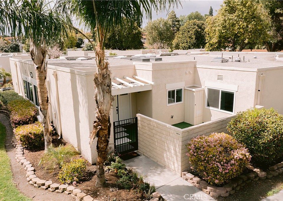 Introducing a truly rare and exceptional offering: a meticulously and luxuriously renovated NEW VALENCIA Model CONDO, nestled in a serene setting exuding cottage-style charm. Upon arrival, one is immediately captivated by the expansive greenery and majestic trees adorning the surroundings. A bespoke wrought iron gate, flourishing floral arrangements, a secluded patio, and elegant leaded glass double doors beckon you into this exquisite residence, which has undergone a complete transformation featuring the most opulent finishes. Step inside to discover a seamless open-concept layout, boasting lofty ceilings, skylights, recessed lighting, new individually zone controlled A/C + heating, and a captivating bonus room that could serve as an office or a quaint library. Every corner is bathed in natural light. This thoughtfully redesigned abode comprises two generously sized bedrooms and two luxuriously appointed bathrooms. Throughout, the ceilings have been artfully smoothed, complemented by wide baseboards and fresh paint. Evident throughout is a meticulous attention to detail, ensuring no aspect was overlooked in revitalizing the beloved New Valencia model. The gourmet kitchen stands as a testament to this, showcasing a two-person breakfast bar, exquisite quartz countertops, premium soft-close shaker cabinets, and brand new stainless-steel appliances. The master bath exudes sophistication with its new cabinets and quartz countertops, while both bathrooms feature quartz showers and top-of-the-line Japanese toilets. Additionally, the washer and dryer are discreetly housed within a hall closet. Conveniently situated, the private carport is mere steps from the front door, completing the epitome of refined living. Don't miss this opportunity to own a truly remarkable residence where every detail has been thoughtfully curated to offer the utmost in comfort and luxury. Residents of this gated premier SENIOR Community of Laguna Woods Village (55+) can relish in amenities such as a 27-hole championship golf course, tennis courts, pools and spas, fitness centers, lawn bowling, an equestrian center, billiards, library, and access to over 200 social clubs. Ideally situated just a few minutes' drive from beautiful Laguna Beach and the Pacific Ocean, the property also benefits from its proximity to various dining and shopping options, including Trader Joe's, and is located near Saddleback Hospital. Residents enjoy complimentary bus transportation within the community.