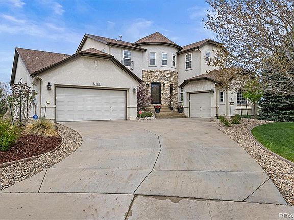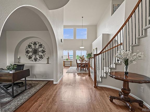 Nestled at the end of a quiet cul-de-sac on an expansive 0.4-acre lot, this beautifully maintained home offers the perfect blend of elegance, functionality, and comfort. A dramatic curved staircase greets you in the foyer, while natural light pours into every corner of the home. Gleaming hardwood floors flow through the formal living and dining rooms, private sitting room/office, and into a chef’s dream kitchen. The kitchen features granite countertops, 42-inch cabinetry, stainless steel appliances (including a wine fridge), a generous island, and a bright breakfast nook. Step outside to a low-maintenance Trex deck—ideal for summer BBQs or unwinding in the hot tub. The family room is designed for relaxation, with entertainment built-ins and a gas fireplace for chilly Colorado evenings. The luxurious main-floor primary suite boasts vaulted ceilings, a walk-in closet, a built-in coffee bar with upper and lower cabinets, and a spa-inspired 5-piece bath with dual vanities, soaking tub, and oversized shower. A powder room and a laundry room with sink complete the main level. Upstairs, you'll find 3 spacious bedrooms and a full hall bath. The finished walkout basement is the ultimate retreat—complete with a large great room, wet bar, game room (pool table and poker table included!), bonus room ideal for a home gym or second office, two additional bedrooms, and a 3/4 bath. This level is perfect for entertaining or could easily serve as a private in-law suite. Step outside to a covered stamped concrete patio and enjoy the beautifully landscaped backyard—ideal for kids, pets, and gatherings. Additional highlights include: class-4 impact-resistant roof shingles, 3-car garage with epoxy flooring, Eufy security system with cameras, brand new carpet, newer interior paint, 50-gallon water heater, plus much more! Located just 10 minutes from downtown Parker, with easy access to trails and recreational amenities. This is Colorado living at its finest—schedule your tour today!