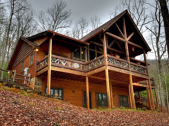 MOUNTAIN LIVING AT IT'S BEST Gorgeous Keith Sumner Home w/ 4 BR, 4 BA incl. sleeping loft home is the ultimate Mtn Lodge! Situated on 5 mtn acres w/ beautiful valley & mtn views w/ Big Creek in the distance - featuring deeded comm access to Big Creek. Open floor plan featuring GR massive Rock FP, cathedral ceilings w/ "modern rustic" design elements throughout. Lg covered "party porch" & screened in porch w/ wrap around porches & decks, grand log entry to "Winding Log Ridge", drive under porte cochere w/ "massive rock columns", walk in stone tiled shower w/ WATERFALL feature, stone countertops & copper sinks, rustic "barn wood" wide plank floors, & custom gourmet KIT. Fin. BA features REC Rm/Den w/ wet bar & gas log FP, NEW Fire Pit, Great for entertaining. Located in the "prime" Aska Adventure Area.