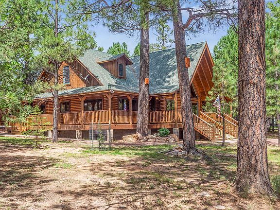 HUGE PRICE REDUCTION!!! THE ULTIMATE IN CABIN LIVING! Fabulous water fall with fish pond by the open patio. This Stunning 3 or possibly 4 bedroom, 4 and 1/2 bath, Full Log Cabin on an acre! No HOA...so your RV/Trailer can be parked in a covered carport on the property. Fully fenced, with beautiful gardens and trees on a drip system. This beauty has an open floor plan, w vaulted wood ceilings, huge custom fieldstone gas F/P in the great room with beautiful wet bar and custom finished bar island. Rustic Aspen interior walls, along with artistic glass etched doors and wood clad pinnacle windows. Absolutely amazing high end kitchen with stainless steel appliances: gas range w/grill, dbl ovens, granite counter tops, walk-in pantry and gorgeous fieldstone backing on custom oak cabinetry. The Majestic Master Suite is incredibly spacious w/ his & her closets, double sinks, custom tiled shower and jetted tub. Each large guest bedroom is another master suite with it's own amazing private bathroom and walk-in closet. Low maintenance trex deck boards on the covered wrap around porch on all four sides of the cabin. The 3000 sq ft 5 car garage hosts a professional workshop area with epoxy floor, air compressor, vaccum system, and built in cabinet storage on the first and second floor. Full bathroom and possible 4th bedroom/bonus room available and attached to garage/workshop. All these areas are heated. 4 large storage sheds on the property are also included. Raised fenced garden and concrete pad for greenhouse. Horses allowed. Come to Happy Jack and Plan to Partake in the Incredible Mountian Experience of Arizona!!