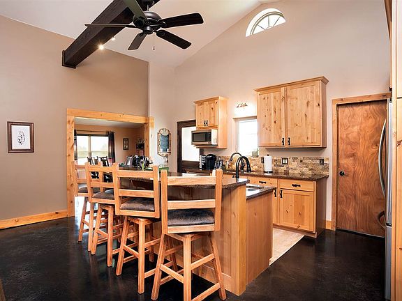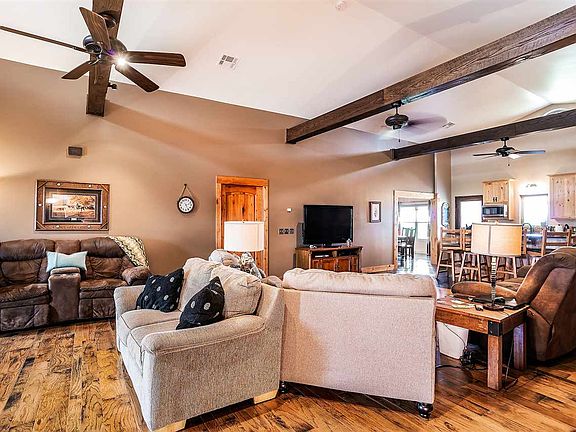 Looking for a Ranch Headquarters with easy access to the Cimarron turnpike? This beautiful property features an automatic gated entrance that leads you onto 15 acres that has been cross fenced. The property features a luxurious 4 bedroom, 3 bathroom home, and livestock facilities. The great room has vaulted ceilings with rustic wood accent beams and hard wood floors. Throughout the remainder of the home you will enjoy polished and stained concrete floors. The kitchen features top of the line stainless steel appliances including a double convection oven, a Jenn-Aire cooktop with downdraft technology, quartz countertops and a tumbled tile backsplash. The Custom cabinets are knotty alder with custom iron hardware. The cabinets have pullout drawers and quiet close doors. To the left of the kitchen is large formal dining room or flex room featuring a built-in display hutch. The large pantry has a hidden surprise. Underfoot is a door that takes you to the storm shelter. The master bath features a 5 piece luxury accommodations with a large walk in shower, a jetted tub, and a double vanity. Attached to the large master bedroom is a home office. As every ranch house should this home has a deluxe mudroom/ laundry room with a sink. To the east of the home is a 2 car garage that is complete with a 1 of the 3 Full bathrooms, a kitchenette, plus heat and air. Outdoor facilities include a 100 x 30 x 18 red steel building, 50 x 26 pole barn, 30 x 60 red steel barn with cement wash racks, multiple overhead doors to control air circulation, it features spray foam insulation on the walls and roof. A multiple pen and paddocks system fans out from this building to aid in livestock handling. There are also multiple automatic cement waters for your livestock needs.