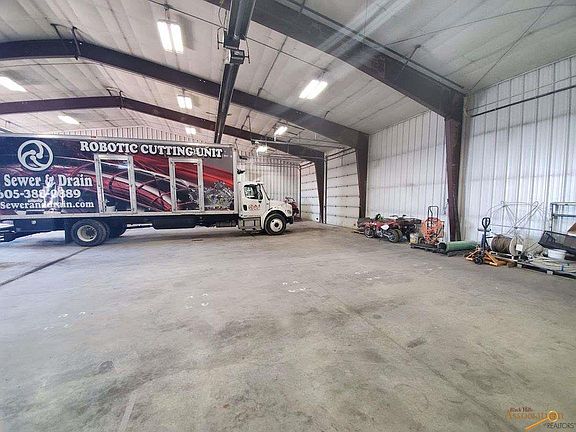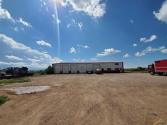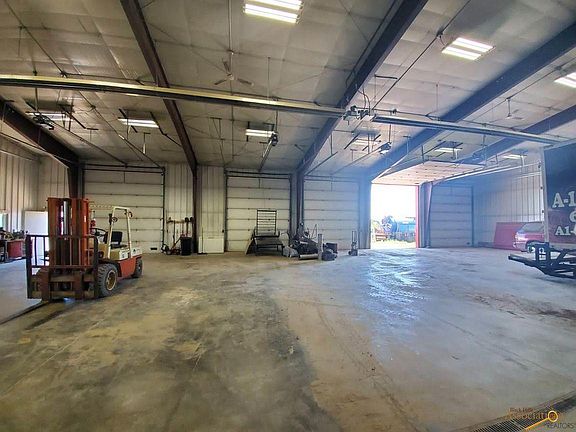Reduced Price! All steel building in Meade County with clear span roof truss with seven 14' high x 12' wide overhead doors (two sets allow drive-through from the front to the rear), 16' high walls with a 2/12 pitch to the center of the roofline and multiple passage doors. Main level shop area is 9,001sf and has two separate zones for MDU gas heat ceiling system. This level also features several office spaces, a reception area, kitchen area, break room and two restrooms (one with a shower). On the upper level, the mezzanine has two access points and is divided between additional warehouse and office space. R25 and R30 insulation in the walls and ceiling. The 6.49-acre parcel is relatively flat and certainly usable for a yard or to add additional buildings. Features a 2k ft deep well. Meade County has a 5-year tax abatement on any vertical commercial improvements valued greater than $30,000.