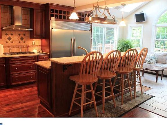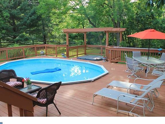 Sought after Sugar Hill Farms Colonial. Beautiful tree lined street with private back yard that backs up to park. This home is located in the charming borough of Collegeville. Just a few blocks from Ursinus College and local small shopping centers. A-Frame addition with skylight was added to the kitchen allowing an unlimited amount of light and entertainment. Huge deck with a pool and hot tub and loads of space for enjoyment. Kitchen is a pleasure to cook in with top of the line Kenmore elite appliances including stainless double convection oven, 5 burner gas cook top, huge stainless refrigerator and dishwasher. Deep double bowl sink and miles of granite. Endless Cherry cabinets and island and a bonus double pantry with a custom built wine rack over head of fridge. Under cabinet lighting. Dark mahogany hardwood floors sweep throughout the first floor. Living room opens with glass french doors and crown molding. Dining room has chair rail and crown molding. Large family room with a custom designed fireplace. Large master suite with his and her closets. Finished basement includes office, bar area, extra room and a toy room. Also added to the list is a full walk up attic. Beautiful gardens and trees. Creek in rear of yard to ad to the charm. Almost a half of acre of nature to enjoy. Short bike ride or walk to the Perkiomen Trail. 5 minute drive to route 422 and Wegmans shopping center.