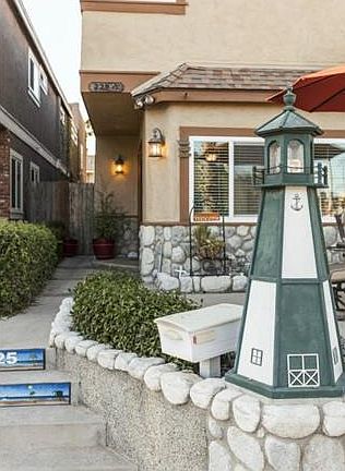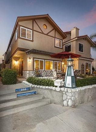 Picturesque home located just 2 blocks to the sandy beach w/Ocean and Catalina views. Home has a large entry & a step down into a versatile front room ideal for formal sitting/office. Home also boasts a formal dining room & galley kitchen w/newer appliances including 5 burner gas cooktop & lots of cabinet space. Family room has a built in bar w/seating along w/a built in wine rack, storage & decorative glass front cabinet doors. Family room also has beamed ceilings and cozy fireplace w/mantle & raised hearth. French doors lead out to the back patio that has been decorated w/artificial grass and entertainment area. There are stairs leading to the second & third floor decks as well. On the second floor there are 3 bedrooms including storage at the top of the stairs & wide staircase. Both secondary bedrooms have vaulted ceilings & reach in closets. Oversized hall bath has dual sinks and newer light fixtures. Master bedroom has double mirrored closets w/balcony, ceiling fan & crown molding. Master bath has dual sinks & large mirror w/a tile surround shower. Roof top deck has wood railing & Ocean, Catalina & sunset views. Further home amenities include crown molding, recessed lighting, lots of storage space, skylights, dual pane windows & steps to the beach.