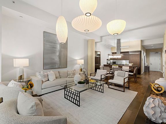 The sleek open chef's kitchen with Viking appliances, Poggenpohl cabinetry, stone countertops, built-in bar area, Miele washer/dryer, tons of closet space, and gorgeous marble bathrooms. The expansive dining and living area is perfect for entertaining.