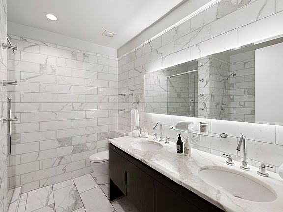 The luxurious master suite features an elegant marble bathroom with a double vanity, deep soaking tub and separate shower stall, and a dressing area with custom built-out closets.